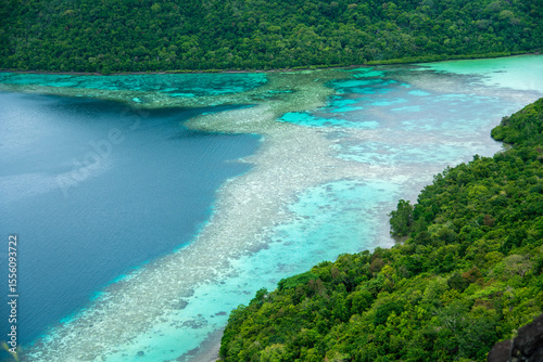 Turquoise ocean sea water white wave splashing deep blue sea. Bird eye view monster wave splash on rock. Tropical sea beach in summer seaside outdoor. Ocean island beautiful dramatic landscape.