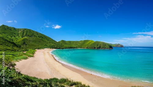 turquoise water meets sandy beach backed by lush green hills under clear blue skies on sunny day