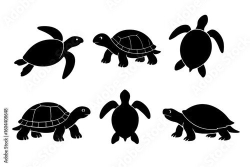 Turtle and tortoise silhouettes vector illustration set. Collection of black reptile icons for wildlife, nature conservation, and marine preservation projects. Sea and land animals.