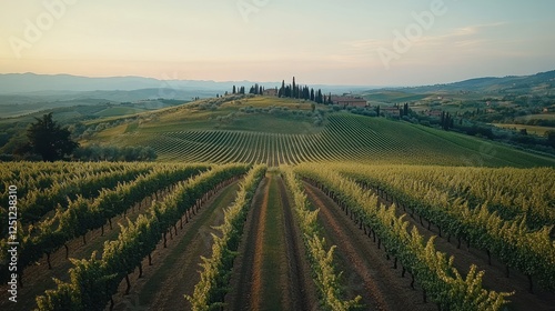 Tuscan vineyard sunrise aerial view, rows of vines, farmhouse hilltop, travel brochure