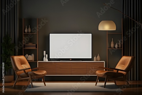 Tv mockup in living room at night. Tv screen, tv cabinet, chairs, bookshelf.