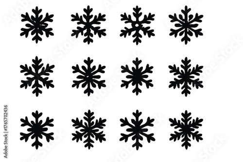 Twelve unique black snowflake silhouettes set for winter holiday decoration