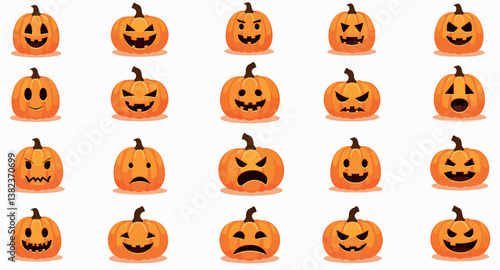 twenty-five pumpkins with carved faces showing various halloween expressions