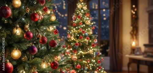 Twinkling candlelight on a decorated Christmas tree with ornaments and garlands, snowflakes, magical ambiance, evergreen branches