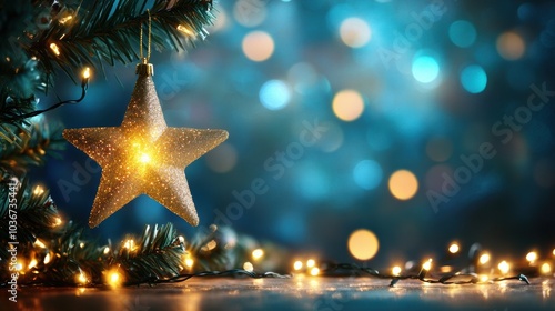 Twinkling lights and a shimmering star hang in the air, creating a magical ambiance during the holiday season under the night sky. Generative AI