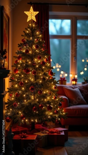 Twinkling lights on a Christmas tree in a cozy room, interior, festive