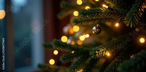 Twinkling string lights under lush garland on Christmas tree, shine, radiant, illuminating
