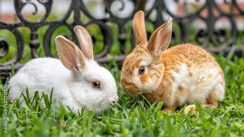 two adorable bunnies, one white and one brown with lop ears, frolicking together amidst lush green grass near a charming fence.