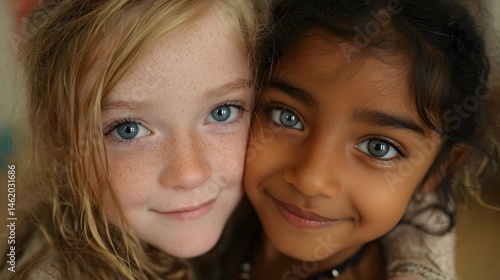 Two adorable young girls with different ethnicities hug and smile sweetly for a close-up portrait.