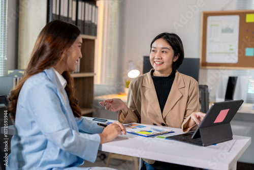 Two asian businesswomen are discussing new project ideas using a tablet and documents with financial charts at the office