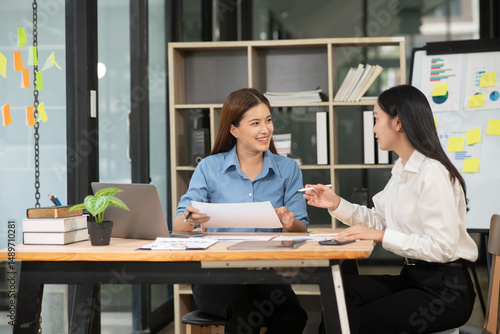 Two Asian businesswomen holding graph papers are sitting and talking happily while working.