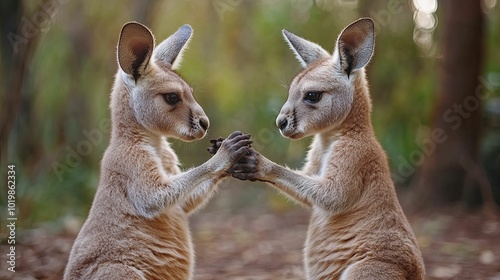 Two baby kangaroos touching paws, facing each other in a forest setting
