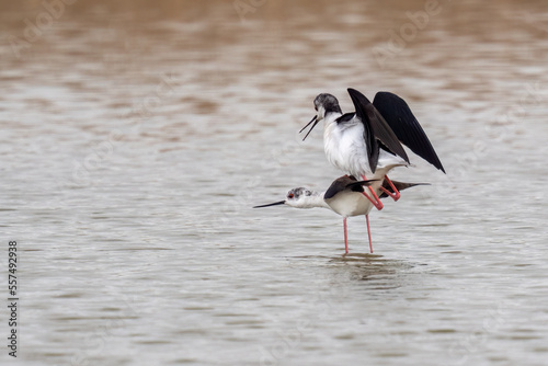 Two beautiful black winged stilt (Himantopus himantopus) during mating