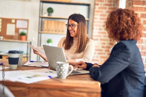 Two beautiful businesswomen smiling happy and confident. Sitting with smile on face working together using laptop at the office