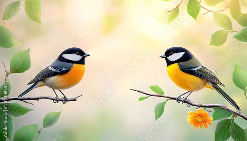 Two birds perched on a branch in spring in sunny background for nature themes generative AI