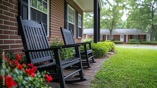 Two black rocking chairs on a porch surrounded by green grass and blooming flowers.