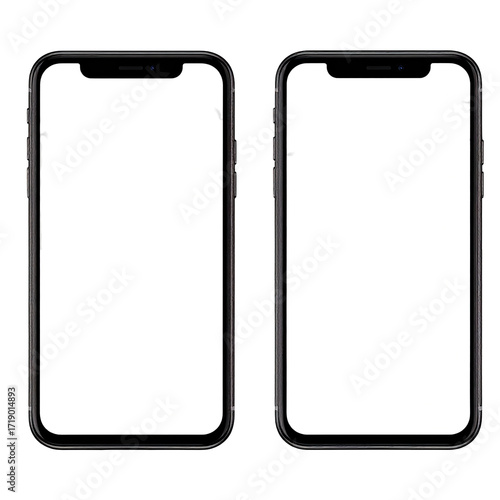 Two black smartphones with blank white screens. Curved edges on the screens. A digital illustration of two phones side by side, set against a solid white background