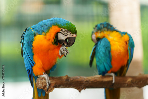 two blue-and-yellow macaw (Ara ararauna), also known as the blue-and-gold macaw on wood tree branch
