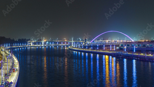 Two bridges over Dubai canal with a boat crossing under them timelapse.