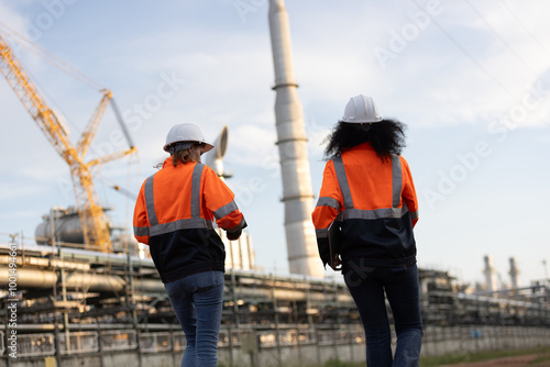 Two brilliant female engineers engaged in a dynamic discussion at a bustling refinery plant in the heart of the industry. Embracing diversity and driving innovation in engineering.