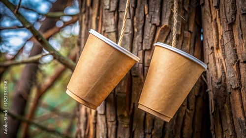 Two brown paper cups connected by a twine thread hanging from a wooden tree branch