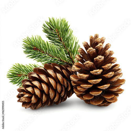 Two brown pine cones with green pine needles on a white background, showcasing natural textures and shapes typical of evergreen trees