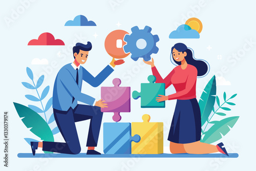 Two business individuals are engaged in teamwork, assembling colorful puzzle pieces to find a solution, two business people are looking for a solution to a business problem