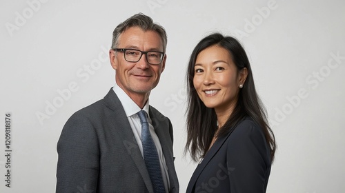 Two business people man and woman standing next to each other looking into the frame smiling. on a white background