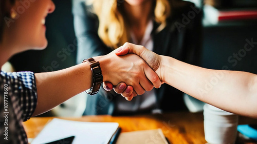Two business professionals shaking hands during a meeting in a modern office setting