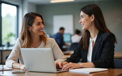 Two business women of young and middle age talking working in Teamwork Finance, Marketing at the office. High quality