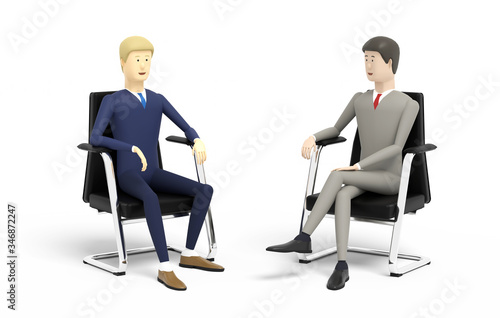 Two businessmen have talks sitting in the armchairs on white background. 3D illustration