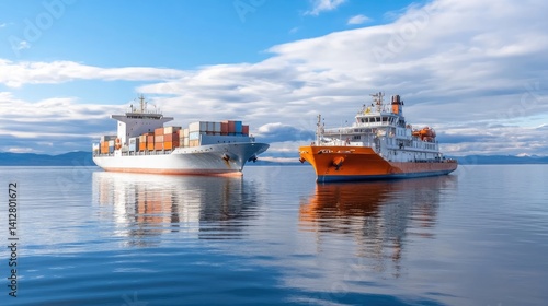 Two cargo ships peacefully anchored in calm waters under a blue sky with fluffy white clouds, symbolizing trade and transportation in maritime industries