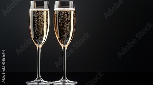 Two champagne glasses with sparkling wine on black
