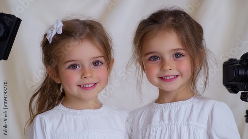 two cheerful girls appearance dress in white participate in the filming of a film with a photo and video camera in the background.