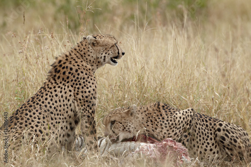 Two cheetah (Acinonyx jubatus) at a zebra kill, Kruger National Park