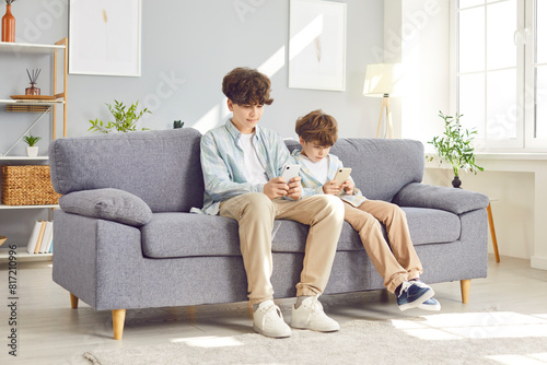 Two children brothers sitting on sofa at home holding mobile phones in hands playing online game or chatting in social media. The concept of kids technology and gadgets addiction problem.