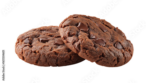 Two chocolate chip cookies on black baking sweet isolated on a transparent background
