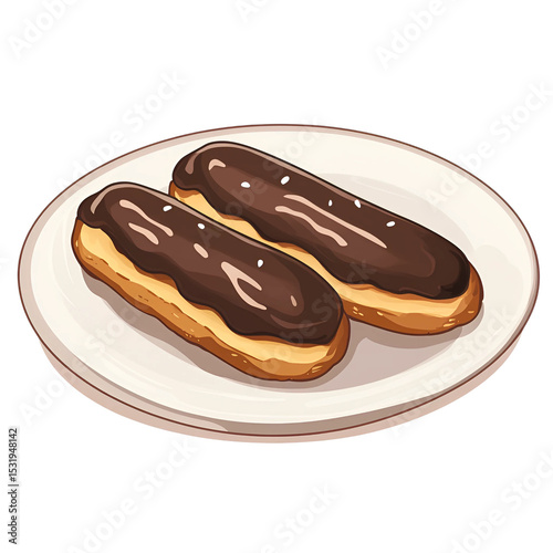 Two chocolate eclairs on white plate isolated on transparent background