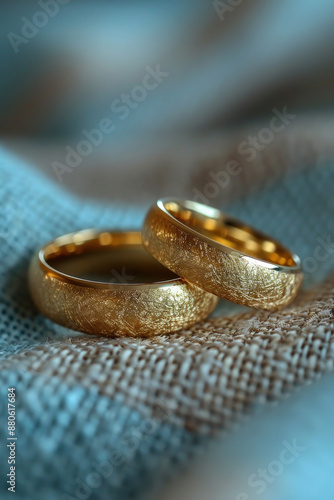 Two classic gold rings with soft defocused blue shiny gilded background. Wedding composition