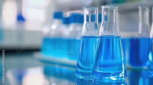 Two clear glass flasks containing vibrant blue liquid are positioned in the foreground of a well-lit laboratory