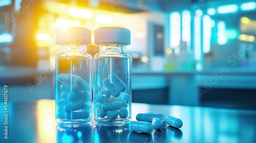 Two Clear Glass Vials Filled with Capsules on a Dark Surface in a Laboratory Environment with Bright Blue and Yellow Lighting Effects