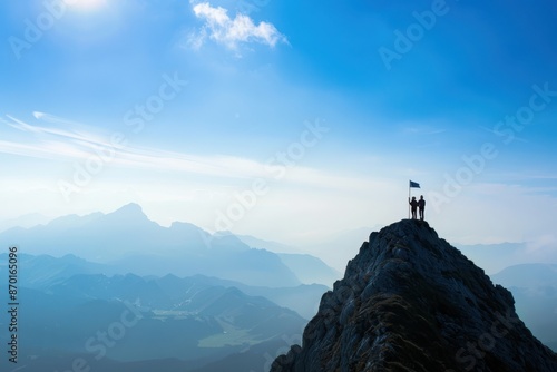 Two climbers standing triumphant on a mountain peak with a flag, admiring the breathtaking view of the surrounding landscape under a clear blue sky.