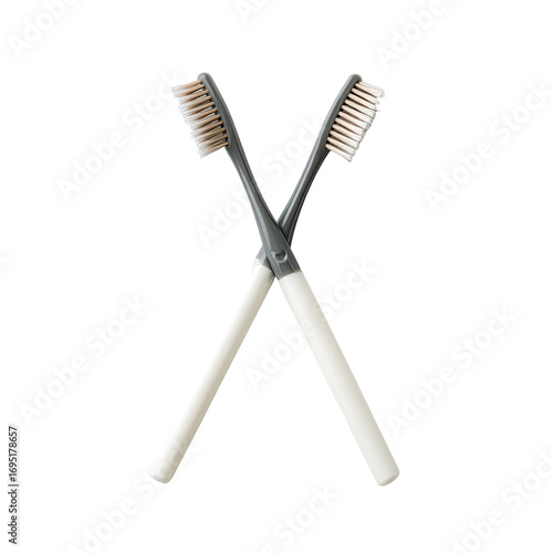 Two crossed toothbrushes, gray handles, white plastic, bristles
