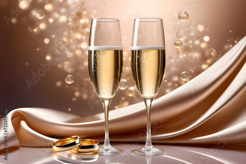 Two cups of champagne with effervescent bubbles, resting beside intertwined golden rings, against a soft-focus, blush-toned backdrop. Generative AI