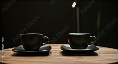Two dark cups on a wooden surface, dimly lit