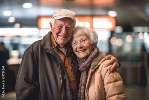 Two elderly couples are at the airport ready to travel together. They love to travel and travel.