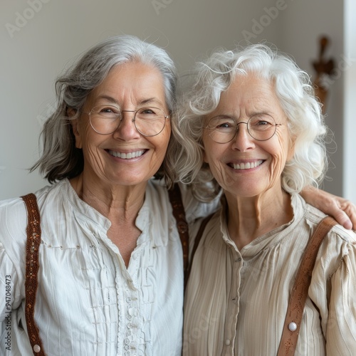 Two elderly female friends or sisters with gray hair and glasses are smiling happily while standing close to one another indoors. One has her hand on the other s shoulder.