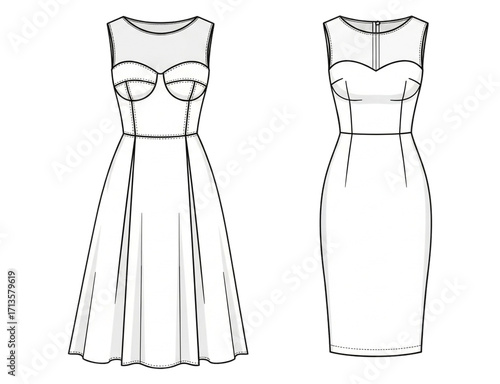 Two elegant dresses isolated on transparent background, one with a flared skirt and the other with a sheath silhouette