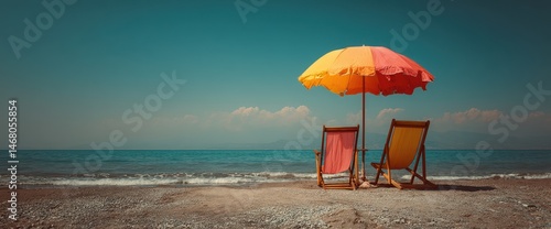 Two empty beach chairs sit under a colorful umbrella on a sunny day. Relaxing beach scene.