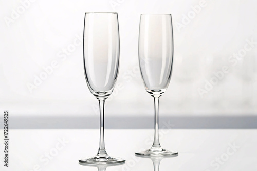 Two empty crystal champagne flutes with long stems positioned side by side on reflective white surface, pristine and ready.